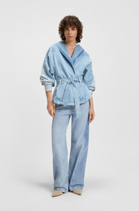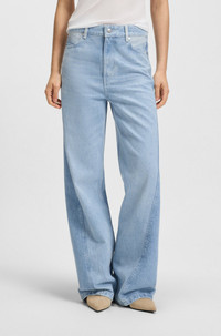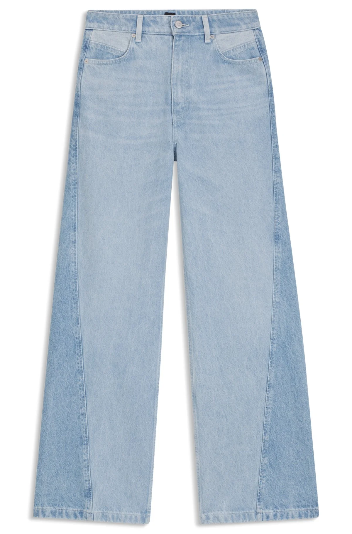 SIZE AND FIT The model wears a size 27 and is 5'9" tall with a, 31" chest, 24" waist and 35" hips. DETAILS C_ PANEL JEANS HR - 50554682 With cut-and-sew contrasting panels and seamlines, these BOSS Womenswear jeans are a flattering take on the wide-leg style. Blue rigid denim. Straight fit Button and zip closure Pockets bottom front: Side pockets Pockets bottom back: Patch pocket QUALITY & CARE INSTRUCTIONS Do Not Tumble Dry Iron Medium Heat Machine Wash Cold Gentle Quality: 100% Cotton (20% recycled), pocketing: 70% Polyester, 30% Cotton Do Not Dry Clean Do Not Bleach