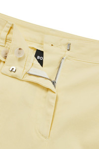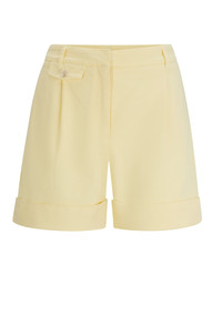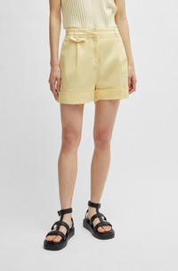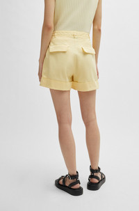 SIZE AND FIT The model wears a size 4 and is 5'10" tall with a, 30" chest, 23" waist and 34" hips. DETAILS Tasandria-D - 50513629 Summery shorts by BOSS Womenswear. Designed with cuffed hems, this wide-leg pair is trimmed with a buttoned pocket detail at the front. Relaxed fit High rise Wide leg Fit foot width: 62,0 cm (24.4 inches) QUALITY & CARE INSTRUCTIONS Iron Low Heat Quality: 98% Cotton, 2% Elastane, pocketing: 100% Cotton Machine Wash Cold Gentle Reduced Dry Clean Do Not Bleach Do Not Tumble Dry