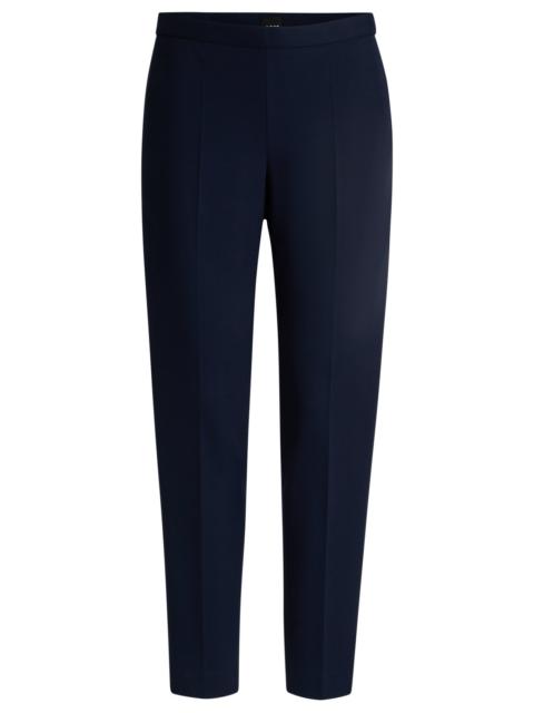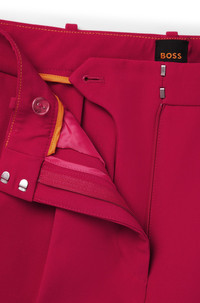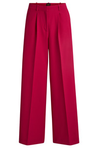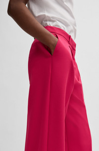 SIZE AND FIT The model wears a size 4 and is 5'11" tall with a, 31" chest, 23" waist and 34" hips. DETAILS C_Tiwi1 - 50535207 Contemporary trousers by BOSS Womenswear. Available with a coordinating blazer, this smart pair is cut with a wide leg in stretch material. Oversized fit Regular rise Button and zip closure Wide leg Pockets bottom front: Side pockets QUALITY & CARE INSTRUCTIONS Quality: 87% Polyester, 13% Elastane, pocketing: 100% Polyester Dry Clean Only Do Not Tumble Dry Do Not Bleach Machine Wash Cold Gentle Iron Low Heat