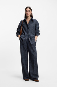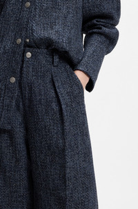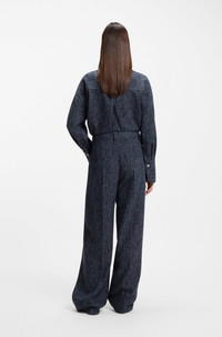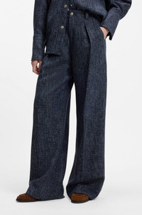 DETAILS In denim-look stretch tweed with cotton, these BOSS Womenswear trousers are a modern formal base. Wide-cut leg with front pleats. wide leg fit Low rise Button and zip closure Wide leg Pleat front Pockets bottom front: French pocket Fit foot width: 62,0 cm (24.4 inches) C_Tanjura4 - 50553824 QUALITY & CARE INSTRUCTIONS Do Not Bleach Do Not Wash Dry Clean Only Material: 40% Polyacrylic, 29% Cotton, 23% Polyester, 7% Viscose, 1% Elastane, Lining: 100% Viscose Do Not Tumble Dry Iron Low Heat