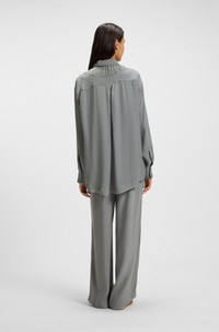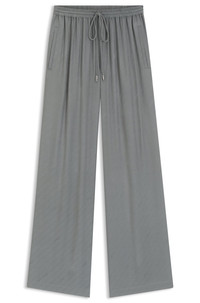 SIZE AND FIT The model wears a size 4 and is 5'9" tall with a, 31" chest, 23" waist and 35" hips. DETAILS C_Tane - 50544016 With an all-over logo jacquard, these BOSS Womenswear trousers offer a modern foundation. Cut with a wide leg in drapey fabric. Comfortable drawstring waist. Relaxed fit Regular rise Wide leg Unlined QUALITY & CARE INSTRUCTIONS Hand Wash Only Do Not Tumble Dry Reduced Dry Clean Iron Low Heat Quality: 100% Viscose Do Not Bleach