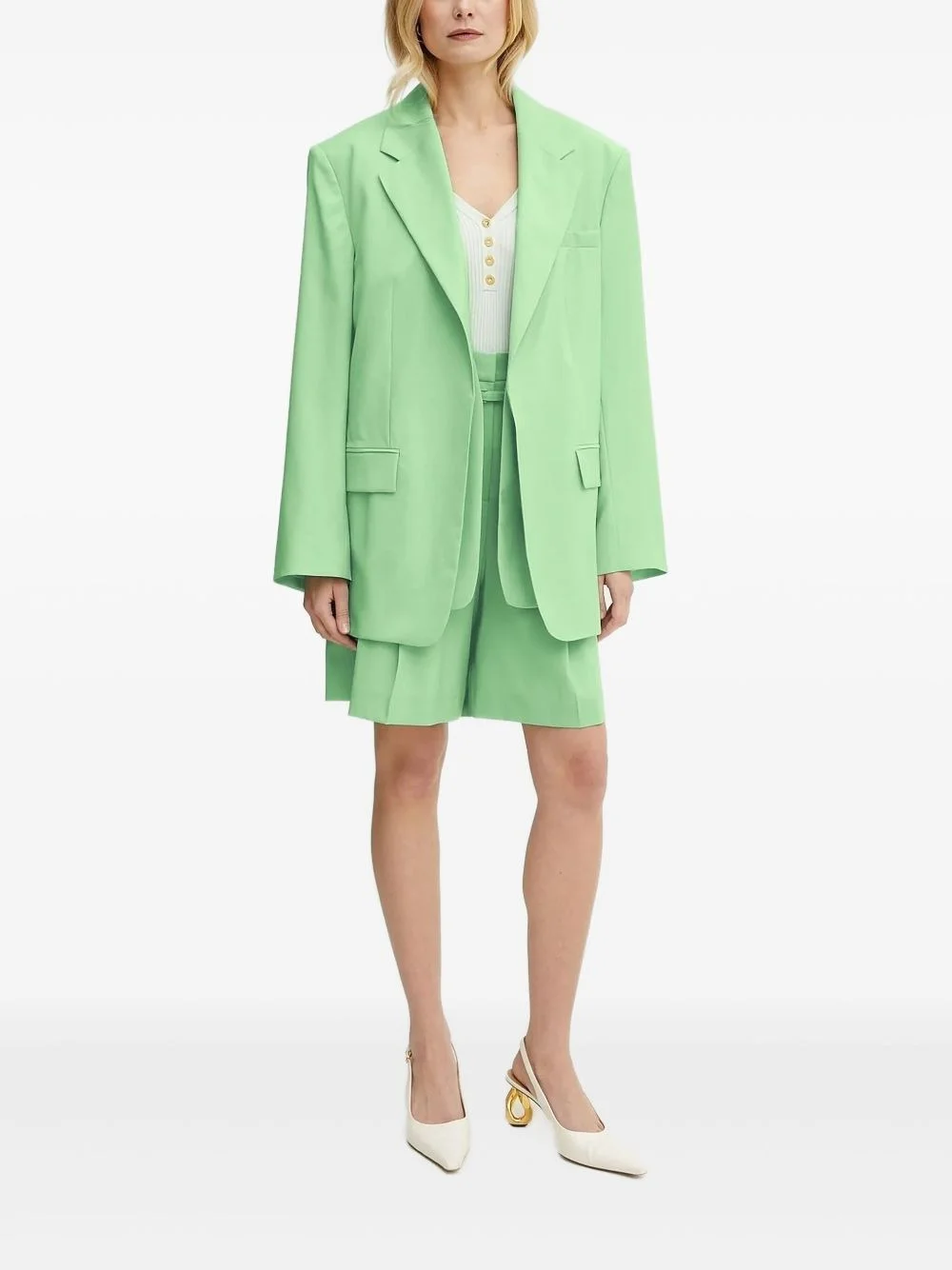 wool single-breasted blazer Highlights - Light green - Wool - Notched lapels - Front button fastening - Welt pockets - Long sleeves Imported Composition Wool 100% Washing instructions Dry Clean Only