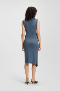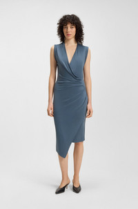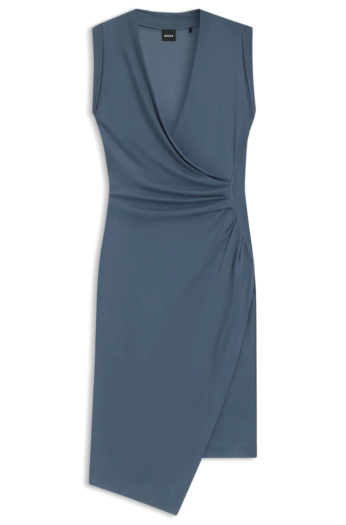 SIZE AND FIT The model wears a size S and is 5'10" tall with a, 31" chest, 24" waist and 34" hips. DETAILS Ecupri - 50543243 A contemporary dress by BOSS Womenswear. Featuring gathered details to accentuate the wrap front, this elegant dress has a V neckline and asymmetric hemline for a balanced silhouette. The extra-soft jersey is blended with stretch for comfort. Slim fit Neckline: V-neck Side slit Unlined QUALITY & CARE INSTRUCTIONS Quality: 51% Cupro, 46% Modal, 2% Polyamid, 1% Elastane Do Not Dry Clean Cold, gentle machine wash; reduced spin speed. Do Not Tumble Dry Do Not Bleach Iron Low Heat