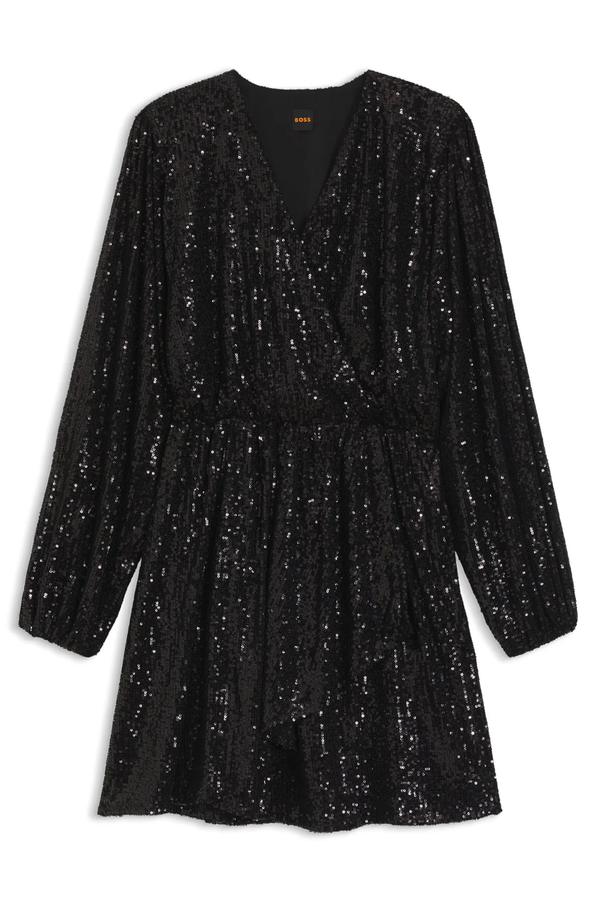 SIZE AND FIT The model wears a size 4 and is 5'9" tall with a, 32" chest, 23" waist and 35" hips. DETAILS Cut to a short length with a wrap front, this BOSS Womenswear dress has all-over sequins for evening-ready style. Elasticated cuffs. Regular fit Neckline: V-neck Long sleeves Elasticized cuffs Partially lined Fit back length: 90 cm (35 inches) C_Dilloi - 50548326 QUALITY & CARE INSTRUCTIONS Do Not Bleach Do Not Dry Clean Do Not Tumble Dry Material: 95% Polyester, 5% Elastane, Lining: 100% Polyester Hand Wash Only Do Not Iron