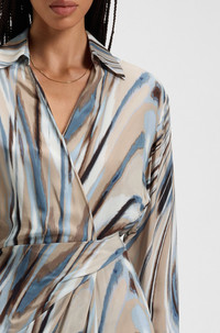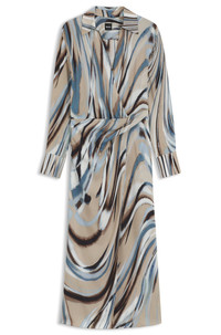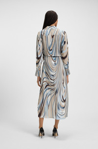 DETAILS Delanya - 50548281 Featuring a collar and wrap front, this slim-fitting BOSS Womenswear dress is an effortless daywear option. Statement swirl print all over. Long sleeves Slim fit Neckline: V-neck Fastening top: Side zip closure Long sleeves Button cuffs Front slit Fit back length: 135 cm (53 inches) QUALITY & CARE INSTRUCTIONS Reduced Dry Clean Do Not Bleach Do Not Tumble Dry Do Not Wash Iron Low Heat Quality: 100% Viscose