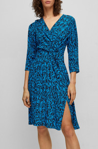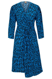 SIZE AND FIT The model wears a size 2 and is 5'10" tall with a, 33" chest, 25" waist and 35" hips. DETAILS Danottea - 50498062 A V-neck dress with a wrap front and seasonal print by BOSS Womenswear. Fit back length: 100 cm (39 inches) QUALITY & CARE INSTRUCTIONS Do Not Tumble Dry Do Not Bleach Quality: 100% Viscose Do Not Wash Iron Low Heat Reduced Dry Clean