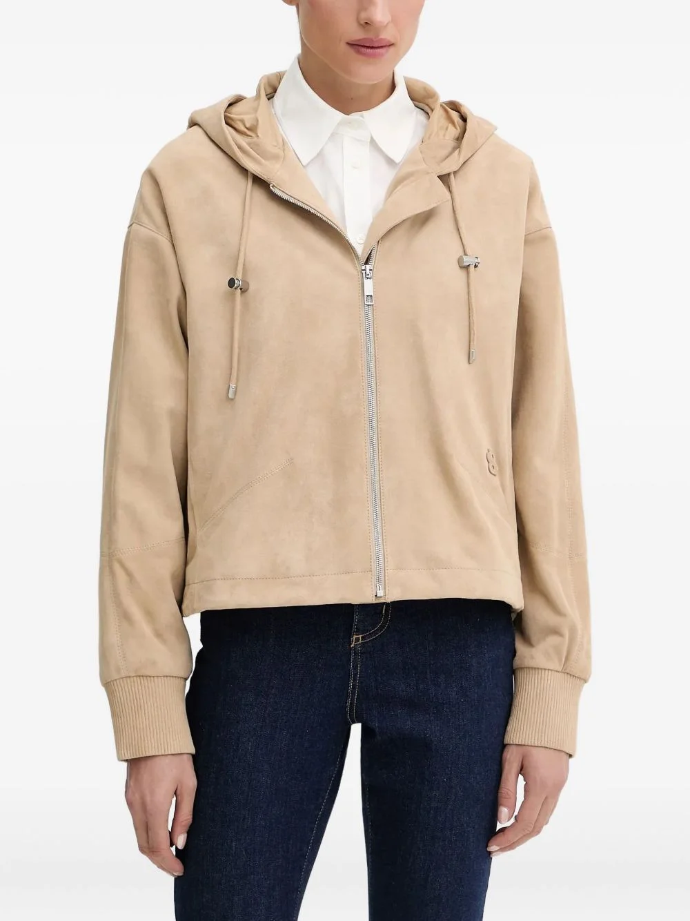 zip-fastening hooded jacket Highlights - Brown - Suede texture - Zip fastening - Drawstring hood - Ribbed cuffs - Long sleeves Imported Composition Calf Leather 100% Washing instructions Read Manufacturer Guidelines