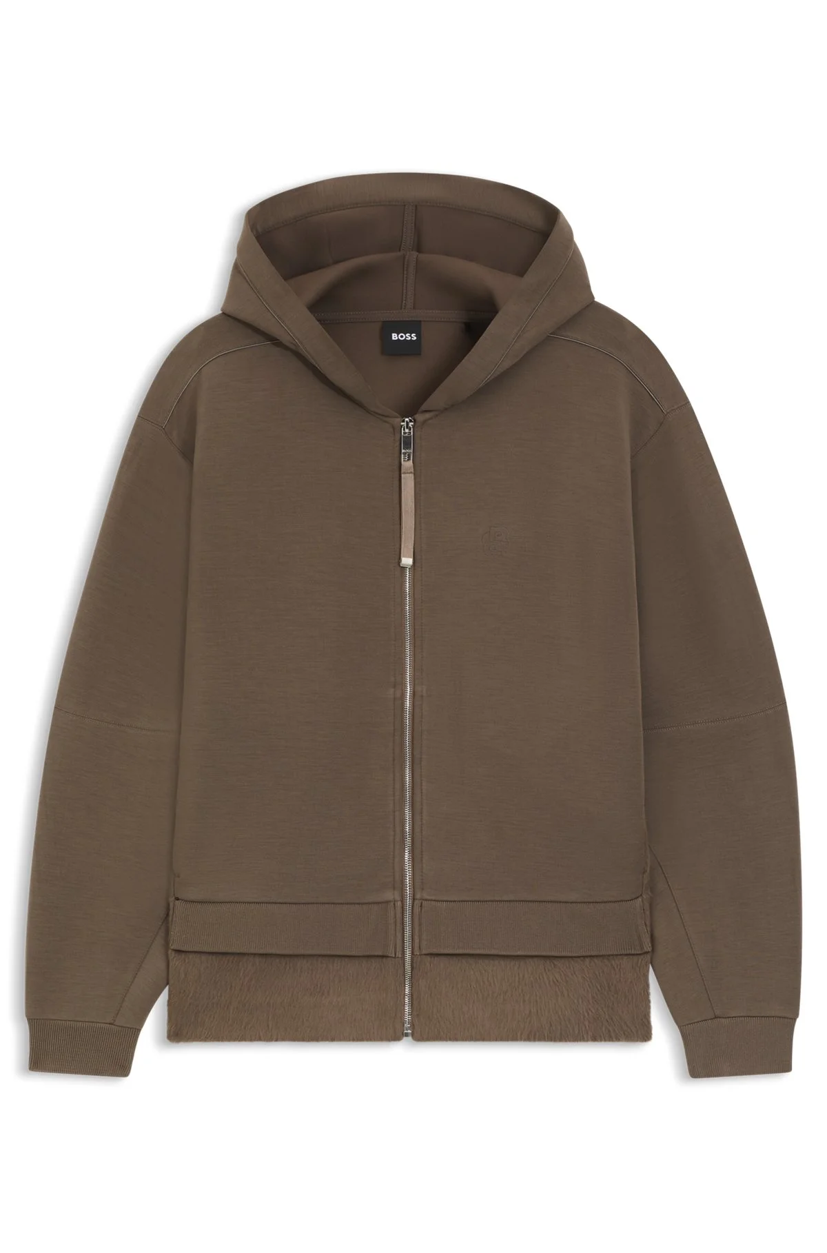SIZE AND FIT The model wears a size S and is 5'10" tall with a, 33" chest, 23" waist and 34" hips. DETAILS Trimmed with a Double B monogram patch, this BOSS Womenswear hoodie combines a soft cotton with furry jersey for statement style. Loose fit. loose fit Neckline: Hooded Fastening top: Zip closure Pockets top: Seam pocket Long sleeves Standard length Edaree - 50548731 QUALITY & CARE INSTRUCTIONS Material: 46% Polyester, 39% Modal, 15% Elastane, Ribbing: 96% Viscose, 4% Elastane, Insert: 52% Cotton, 46% Polyacrylic, 2% Elastane Do Not Bleach Do Not Dry Clean Iron Low Heat Do Not Tumble Dry Cold, gentle machine wash; reduced spin speed.