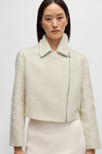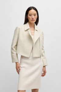 SIZE AND FIT The model wears a size S and is 5'10" tall with a, 31" chest, 23" waist and 35" hips. DETAILS C_Jabi2 - 50524843 A modern jacket by BOSS, designed with an asymmetric zip. This adaptable piece is crafted in boucle fabric blended with a touch of cotton. QUALITY & CARE INSTRUCTIONS Reduced Dry Clean Do Not Bleach Do Not Tumble Dry Quality: 40% Polyester, 35% Polyacrylic, 20% Cotton, 5% Other fibres, Lining: 100% Polyester Do Not Wash Iron Low Heat