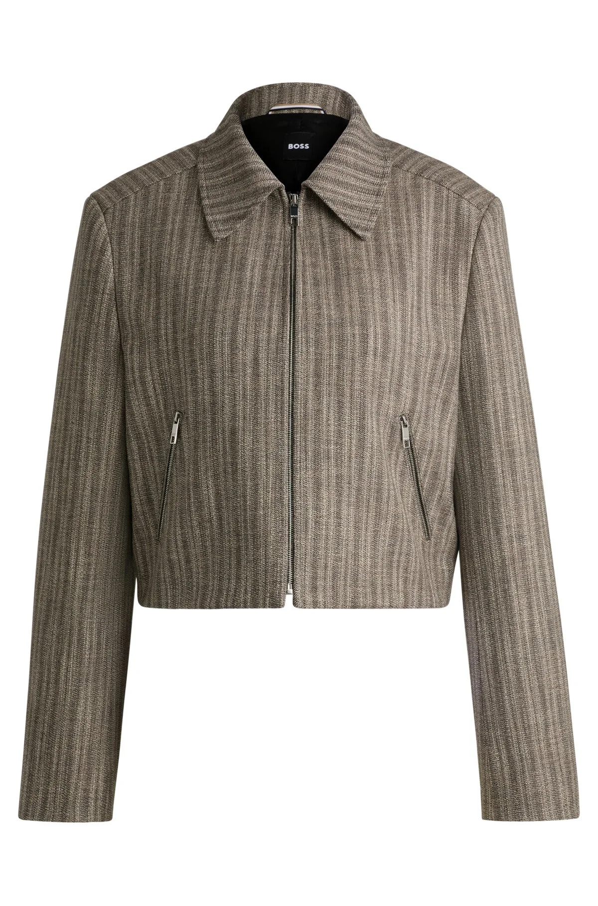 SIZE AND FIT The model wears a size 4 and is 5'8" tall with a, 30" chest, 23" waist and 35" hips. DETAILS Jalerena - 50524046 A cropped striped jacket by BOSS. Featuring a zip front, this modern piece is crafted in melange cloth, with a weighty feel, blended with wool. Fit back length: 50 cm (20 inches) QUALITY & CARE INSTRUCTIONS Iron Low Heat Do Not Wash Quality: 44% Viscose, 26% Wool, 20% Polyester, 9% Polyamid, 1% Elastane, Lining: 100% Viscose Reduced Dry Clean Do Not Bleach Do Not Tumble Dry