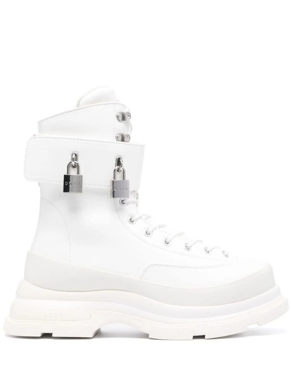 Gao Eva padlock-detail boots Highlights - White - Calf leather - Silver-tone hardware - Padlock detail - Round toe - Front touch-strap over lace-up fastening - Branded insole - Chunky rubber sole Imported Composition Leather 100% SIZE & FIT Measurement HEEL 2.36 in(6 cm) HEIGHT 6.69 in(17 cm)