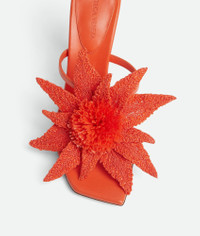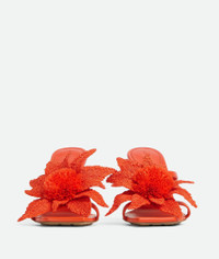 Leather mule sandal with embroidered raffia flower. Product Details - Leather mule sandal with raffia flower embroidery - Material: Lambskin, raffia - Lining: Lambskin - Color: New Orange - Rubber-injected leather outsole - Heel: 9 cm | 3.5” - Made in: Italy - Product code: 816474V54X07511