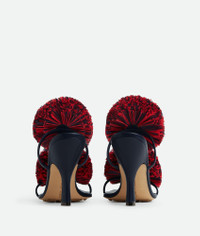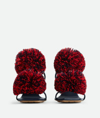 Sandal with multicolour raffia pom-pom embellishments. Realised in soft lambskin. Product details • Leather mule sandal with raffia pompom embellishments Material: 100% Lambskin • Lining: Lambskin • Color: Dark Navy/Dark Navy/Vernis • Bio-based rubber-injected and biodegradable leather outsole • Heel: 9 cm | 3.5" Made in: Italy