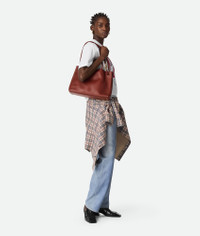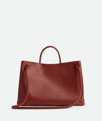 Top handle bag in silky calf leather with signature knot detail and sliding cross-body Product Details - Silky Calfskin top handle bag with sliding cross-body strap - Intrecciato leather internal pocket - Magnetic closure - Material: Calfskin - Lining: Suede - Color: Sapele/Redstone - Hardware: Muse Brass finish - Height: 25cm - Width: 35cm - Depth: 11cm - Handle drop: 8cm - Strap drop: 45 cm | 17.7" - Made in: Italy - Product code: 810214V4O942603