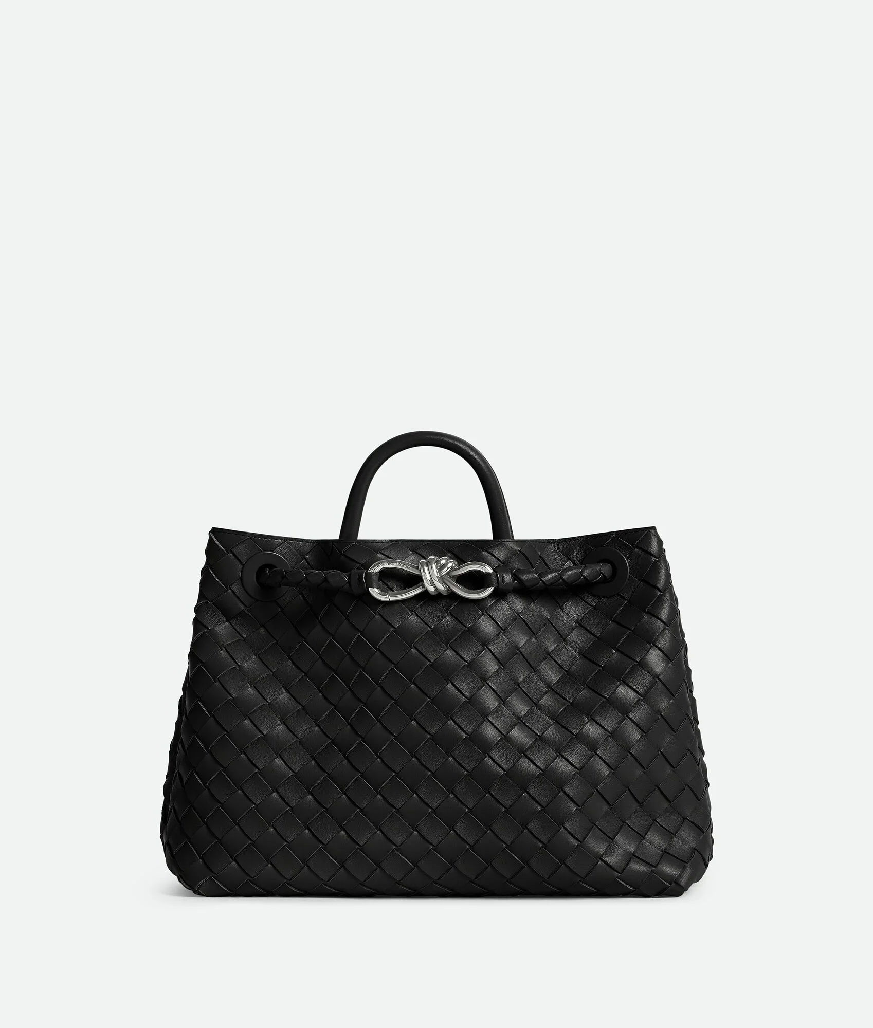 Top handle bag in supple Intrecciato leather with signature knot detail and sliding Product Details - Intrecciato leather top handle bag with sliding cross-body strap - Compartmented interior with one zippered pocket, two open pockets - Magnetic closure - Material: lambskin - Lining: Lambskin bonded Intrecciato - Color: Black - Hardware: Silver finish - Height: 25 cm | 9.8” - Width: 32 cm | 12.6” - Depth: 11 cm | 4.3” - Handle drop: 9 cm | 3.5” - Strap drop: 45 cm | 17.7” - Made in: Italy - Product code: 766016VCPP11249