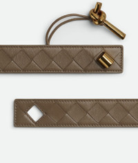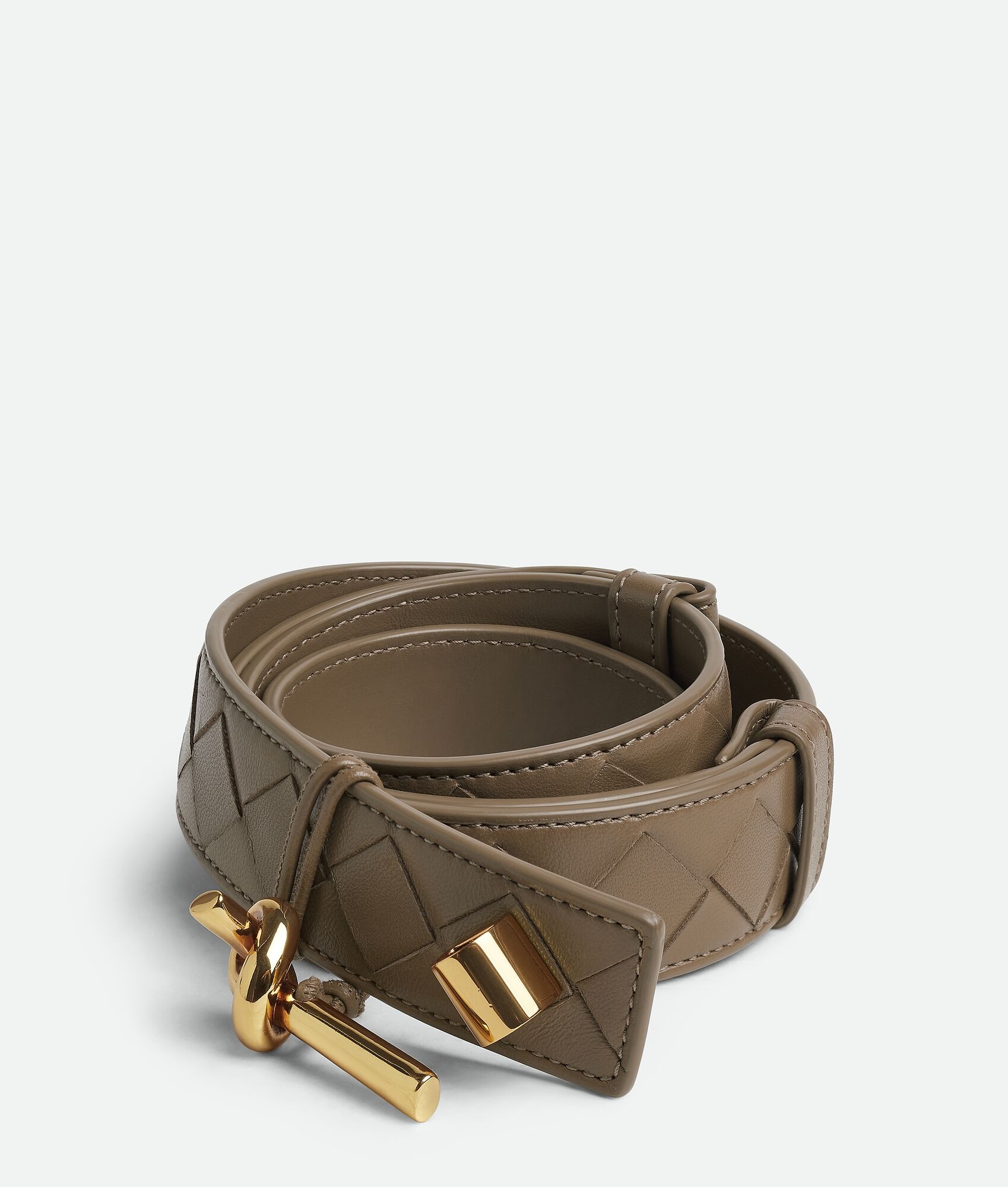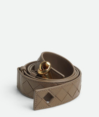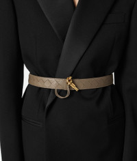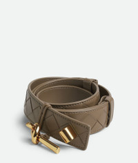 Intrecciato nappa leather belt with Andiamo buckle. Product Details - Pin closure - Adjustment system on the back - Material: lambskin - Lining: Calfskin - Color: Pinecone - Hardware: Muse Brass finish - Height: 3 cm | 1.2” - Depth: 0.5 cm | 0.2” - Made in: Italy - Product code: 806097VCPP52360