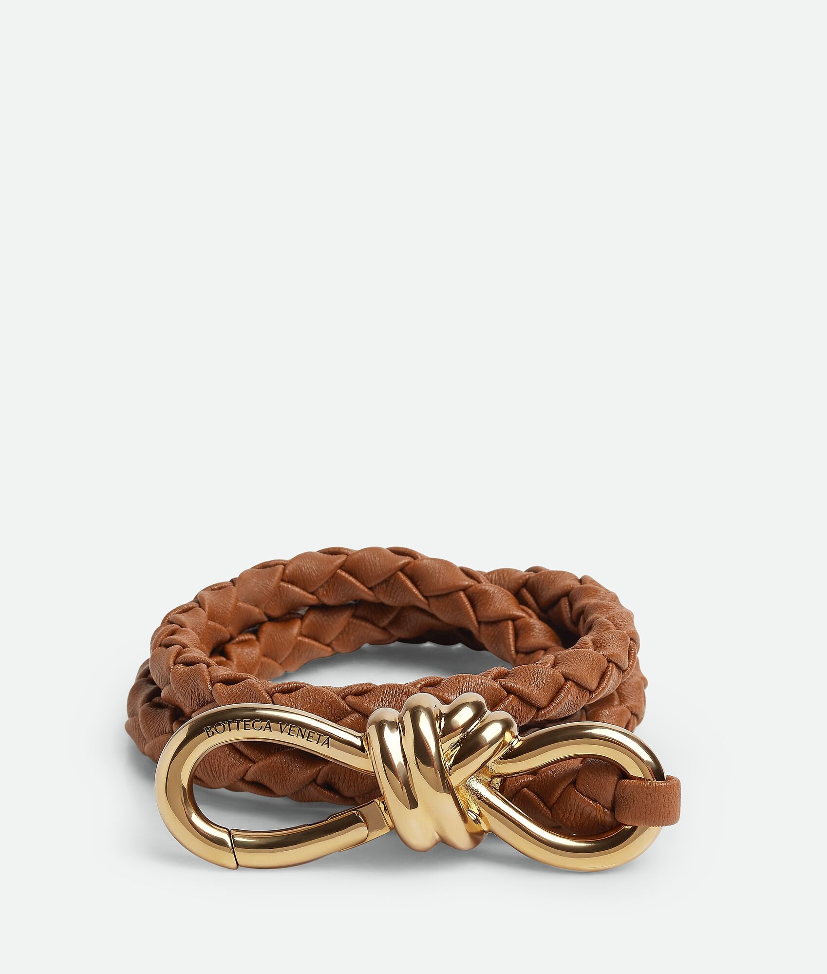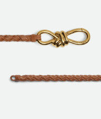 Intreccio nappa leather elastic belt with knot detail. Product Details - Hook closure - Material: Lambskin - Lining: Unlined - Color: Cognac - Hardware: Muse Brass finish - Height: 0.9 cm | 0.4" - Depth: 0.9 cm | 0.4" - Made in: Italy - Product code: 766135V0HW12599