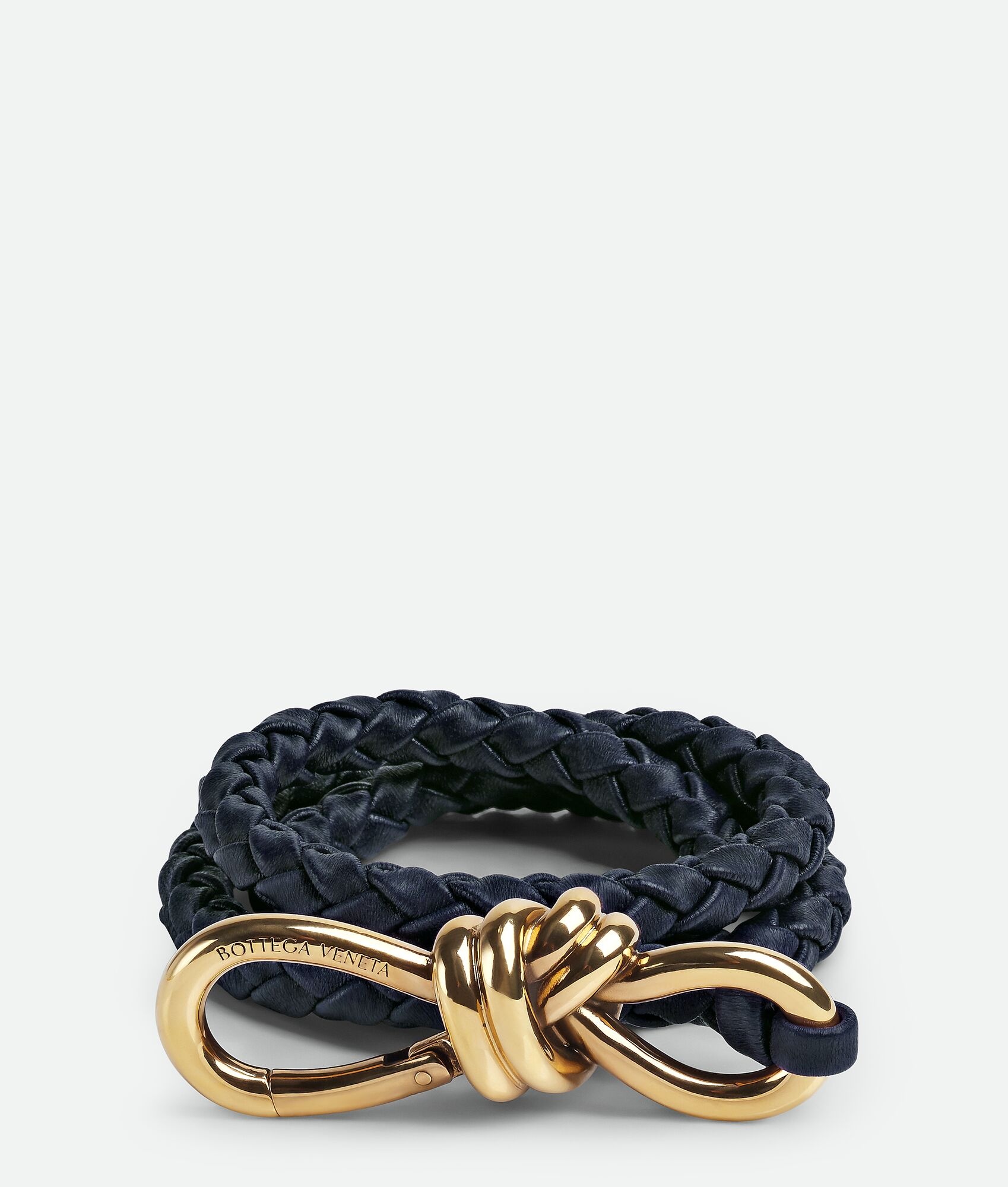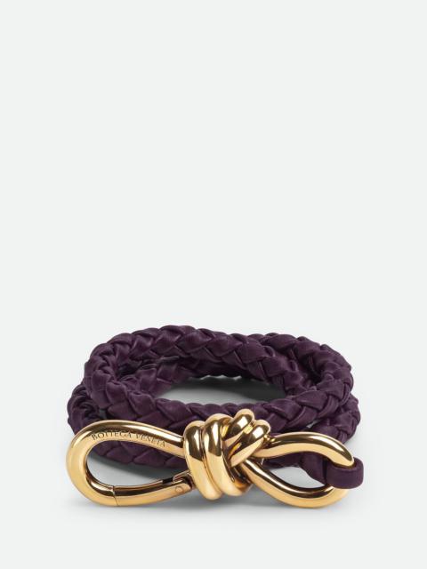 Intreccio nappa elastic belt with knot detail. Product Details - Metal closure - Material: Lambskin - Lining: Unlined - Color: Space - Hardware: Muse brass finish - Height: 0.9 cm | 0.4" - Depth: 0.5 cm | 0.2" - Made in: Italy - Product code: 766135V0HW18847