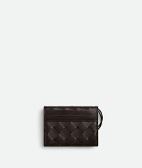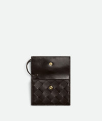 Credit card case in Intrecciato nappa leather with signature knot detail. Product Details - Intrecciato nappa leather card case with metallic knot detail - Three card slots, one flap compartment with press stud closure - Material: Lambskin - Lining: Calf leather - Color: Fondant - Hardware: Muse brass finish - Height: 8 cm | 3.1" - Width: 10.5 cm | 4.1" - Depth: 3.5 cm | 1.4" - Made in: Italy - Product code: 838845VCPP22190