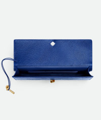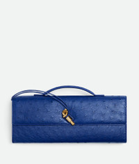 Top handle clutch in ostrich leather with signature knot closure. Product Details - Ostrich leather top handle clutch with metallic knot closure - Six card slots, one additional pocket - Lining: Calfskin - Color: Blue royal - Hardware: Brass finish - Made in: Italy - Product code: 805241V3RQ34300 Material - Material: Ostrich leather Size & Fit - Height: 13 cm (5.1") - Width: 31 cm (12.2") - Depth: 3 cm (1.2") - Handle drop: 2 cm (0.8") - Fits iPhone 16 Pro Max, a credit card case, airpods and keys.