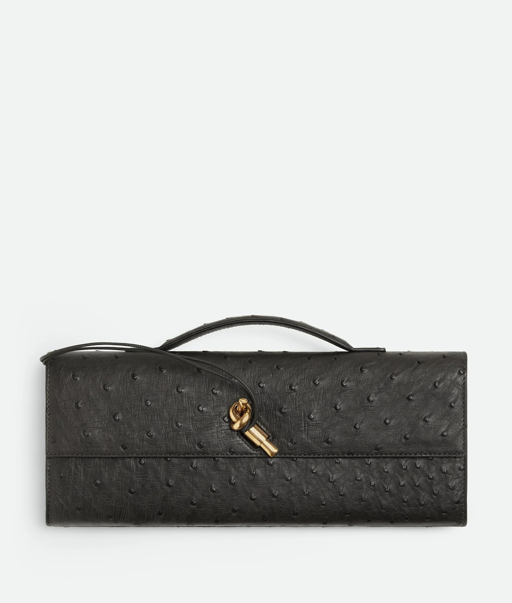 Top handle clutch in ostrich leather with signature knot closure. Product Details - Ostrich leather top handle clutch with metallic knot closure - Six card slots, one additional pocket - Lining: Calf leather - Color: Graphite - Hardware: Brass finish - Made in: Italy - Product code: 805241V3RQ31040 Material - Material: Ostrich leather Size & Fit - Height: 13 cm | 5.1" - Width: 31 cm | 12.2" - Depth: 3 cm | 1.2" - Handle drop: 2 cm | 0.8" - Fits iPhone 16 Pro Max, a credit card case, airpods and keys.