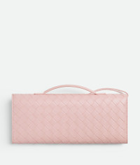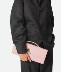 Top handle clutch in supple Intrecciato leather with signature knot closure. Product Details - Intrecciato leather top handle clutch with metallic knot closure - Six card slots, one additional pocket - Material: Lambskin - Lining: Calfskin - Color: Rose - Hardware: Brass finish - Height: 13cm - Width: 31 cm | 12.2" - Depth: 3 cm | 1.2" - Made in: Italy - Product code: 741511VCPP36858 Size & Fit - Fits iPhone 16 Pro Max, a credit card case, airpods and keys.
