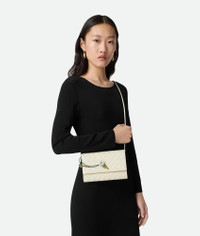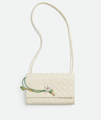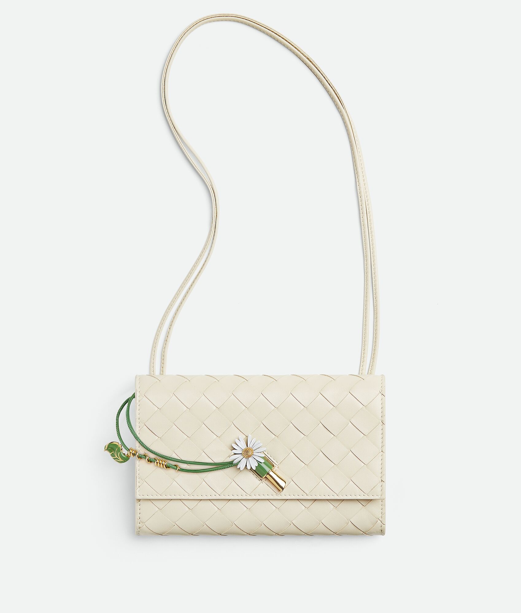 Product Details - Intrecciato nappa leather pouch - One main compartment, two card slots - Enamelled daisy flower closure - Sliding leather strap - Lining: Calfskin - Colour: Sea Salt - Hardware: Muse brass finish - Height: 12.6 cm | 5" - Width: 19 cm | 7.5" - Depth: 2 cm | 0.8" - Strap drop: 55 cm | 21.7" - Made in: Italy - Product code: 838870V4SCH9111