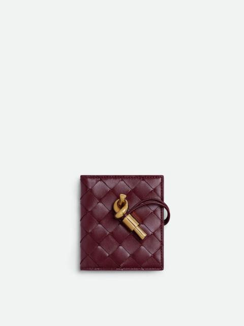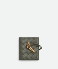 Flap card case in Intrecciato nappa leather with signature knot closure. Product Details - Intrecciato nappa leather card case - Four card slots, two additional pockets - Metal knot closure - Lining: Calfskin - Color: Pickle - Hardware: Muse Brass finish - Made in: Italy - Product code: 836943VCPP23293 Material - Material: Lambskin Size & Fit - Height: 9.8 cm (3.9") - Width: 8.7 cm (3.4") - Depth: 0.5 cm (0.2")