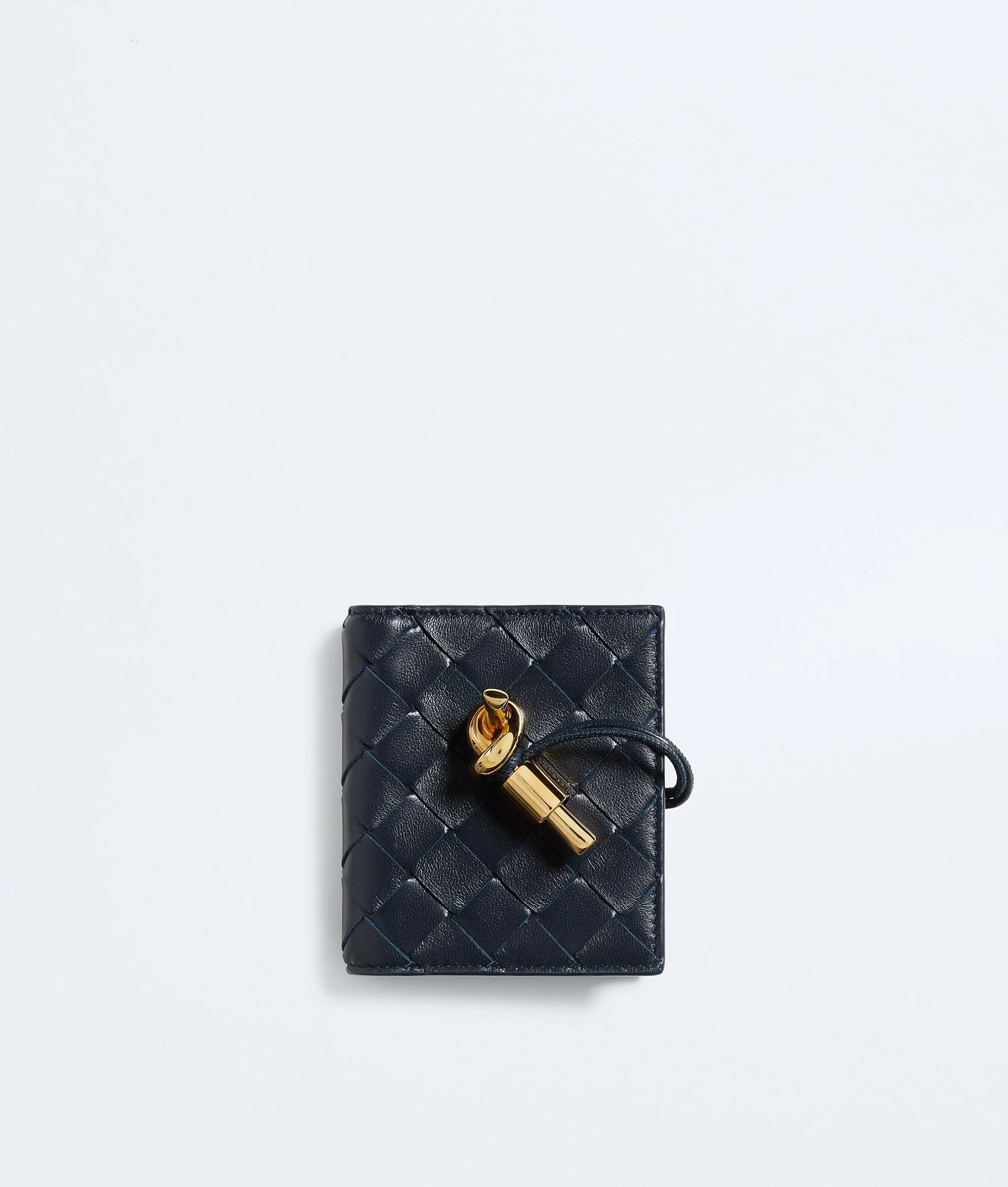 Flap card case in Intrecciato nappa leather with signature knot closure. Product Details - Intrecciato nappa leather card case - Four card slots, two additional pockets - Metal knot closure - Colour: Midnight - Hardware: Muse Brass finish - Lining: Calfskin - Made in: Italy - Product code: 836943VCPP24338 Material - Material: calfskin Size & Fit - Height: 9.8 cm | 3.5" - Width: 8.7 cm | 3.2" - Depth: 0.5 cm | 0.2"