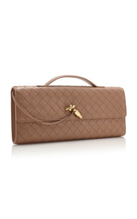 Bottega Veneta (meaning "Venetian Artisanal Workshop" in its native Italian) unites different people, ideas, and perspectives with an unwavering commitment to excellence and a unique vision of luxury. With solid foundation, each season builds off the other, delivering new iterations of coveted house signatures with contemporary, yet timeless, flare. Made from the house's iconic Intrecciato-woven leather, the clutch iteration of the 'Andiamo' style features a 'Knot' brass clasp — another brand signature. The lining has six card slots and one additional pocket. PRODUCT DETAILS - Clasp fastening - Composition: nappa leather - Designer color: Biscuit - Made in Italy SIZE & FIT - This item measures 5.1 x 12.2 x 1.2”
