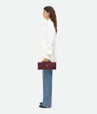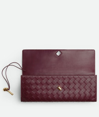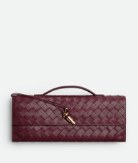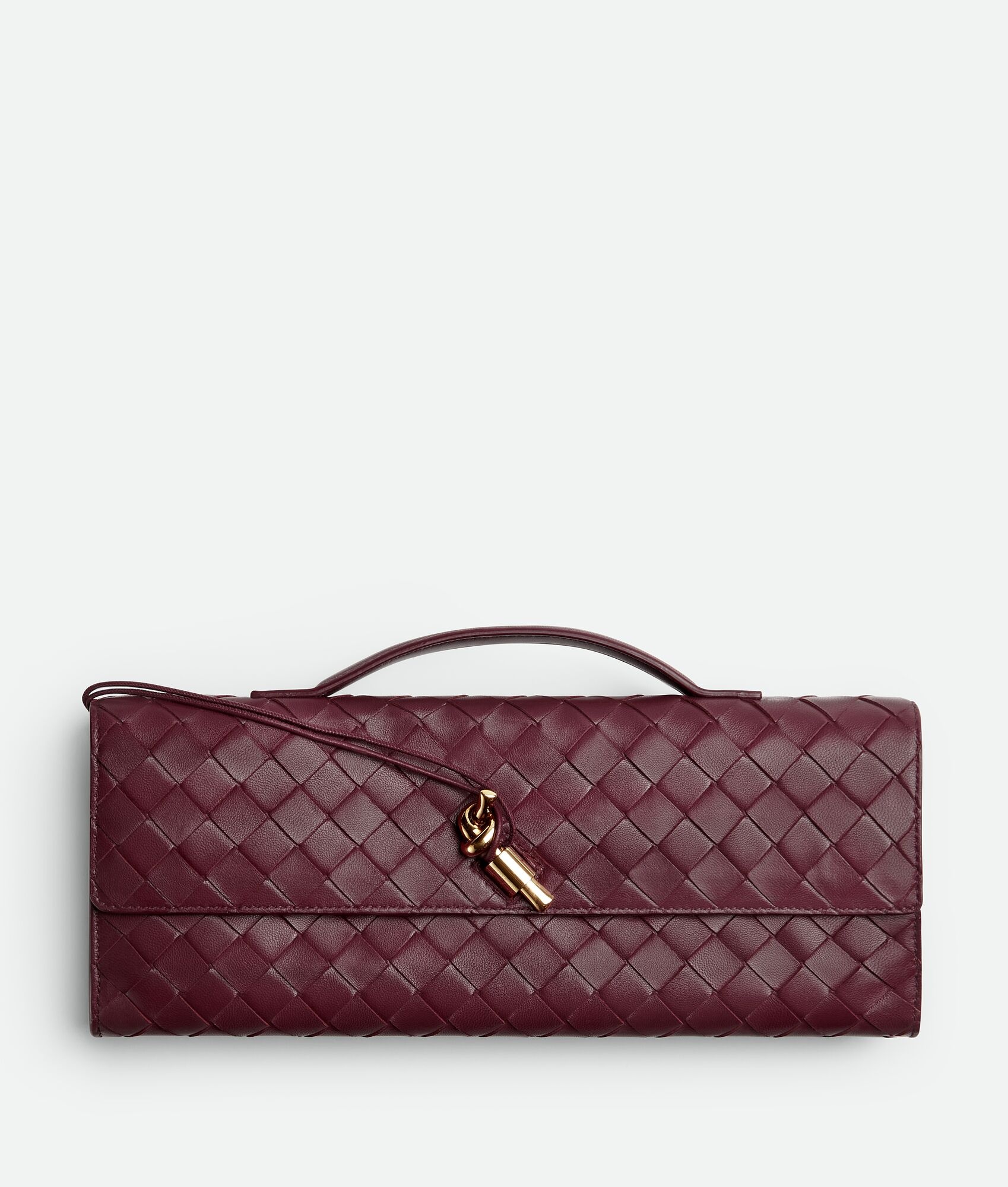 Clutch with handle realised with Intrecciato craftsmanship in soft lambskin leather Product details • Intrecciato leather handle clutch with metallic knot closure • Six card slots, one additional pocket • Metal knot closure Material: 100% Lambskin • Lining: Calfskin • Color: Barolo • Hardware: Muse brass finish • Height: 13 cm | 5.1" • Width: 31 cm | 12.2" • Depth: 3 cm | 1.2" Made in: Italy