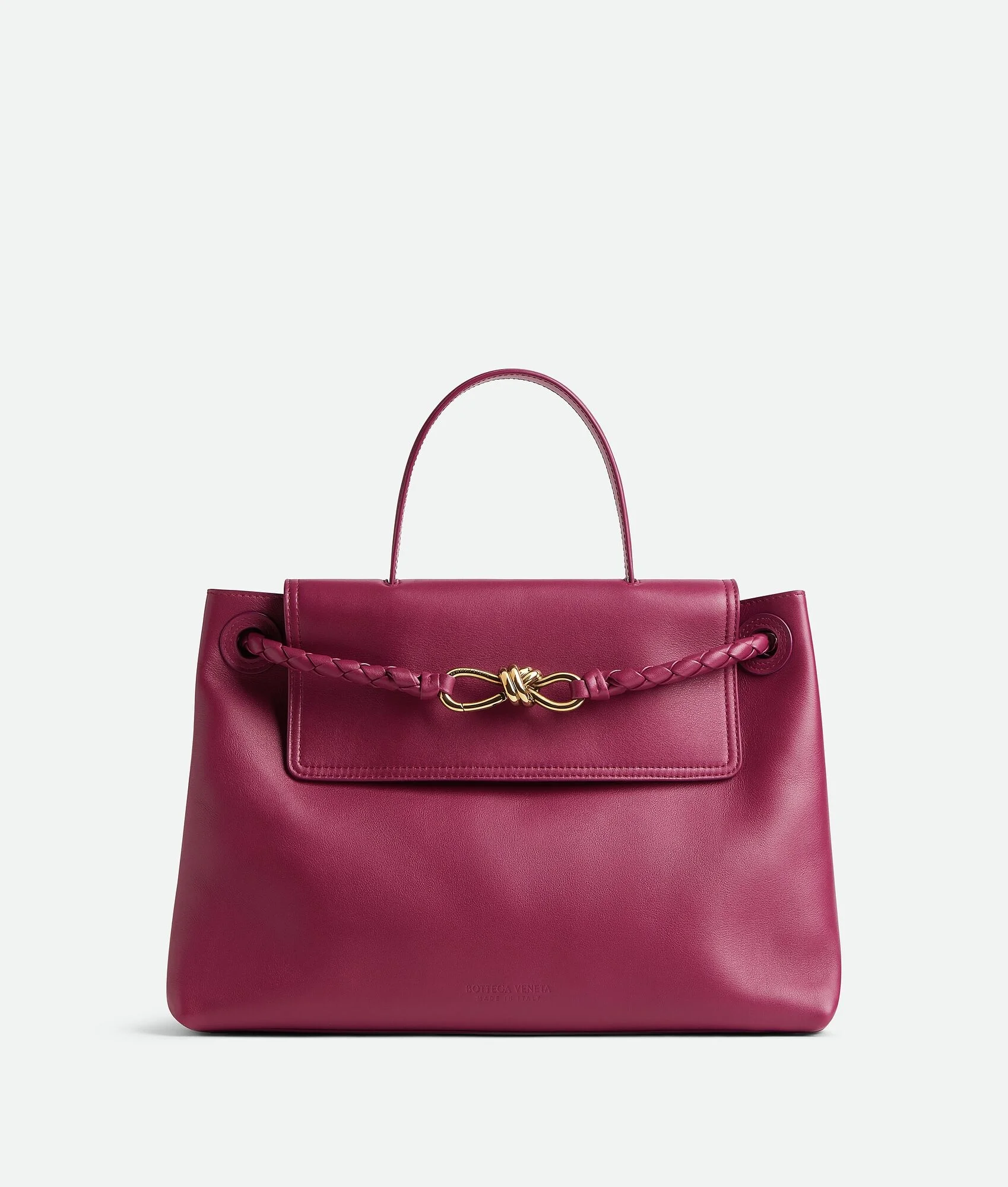Product Details - Silky calf leather top-handle bag with two-way flap - Sliding shoulder-carry strap - Adjustable and detachable cross-body strap - Compartmented interior with one zipped pocket - Hook closure - Lining: Bonded suede - Color: Cinnabar - Hardware: Brass finish - Height: 26 cm | 10.2" - Width: 34 cm | 13.4" - Depth: 15 cm | 5.9" - Handle drop: 11 cm | 4.3" - Strap drop: 55 cm | 21.7" - Made in: Italy - Product code: 817231V4O925568