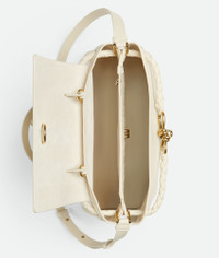 Top handle bag in silky calf leather with two-way flap and signature knot detail. Product Details - Silky calf leather top-handle bag with two-way flap - Sliding shoulder-carry strap - Adjustable and detachable cross-body strap - Compartmented interior with one zipped pocket - Hook closure - Material: Calfskin - Lining: Bonded suede - Color: Sea salt - Hardware: Brass finish - Height: 26 cm | 10.2" - Width: 34 cm | 13.4" - Depth: 15 cm | 5.9" - Handle drop: 11 cm | 4.3" - Strap drop: 55 cm | 21.7" - Made in: Italy - Product code: 817231V4O929195