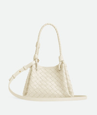 Shoulder bag in supple Intrecciato leather with signature knot detail and detachable Product Details - Small Intrecciato leather shoulder bag with detachable cross-body strap - One main compartment - Magnetic tab closure - Material: lambskin - Lining: Lambskin bonded Intrecciato - Color: Sea Salt - Hardware: Brass finish - Height: 16.5 cm | 6.5" - Width: 21 cm | 8.3" - Depth: 17 cm | 2.6" - Handle drop: 20 cm | 7.9" - Strap drop: 55 cm | 21.7" - Made in: Italy - Product code: 796569VCPPT9195