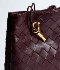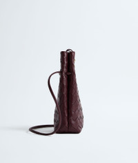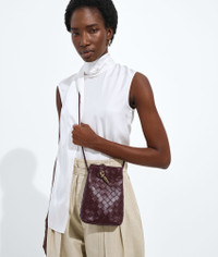 Product Details - Intrecciato nappa leather phone pouch - One main compartment - Metal knot closure - Sliding leather strap - Colour: Deep Mahogany - Hardware: Muse Brass finish - Lining: Nappa - Made in: Italy - Product code: 843890VCPP06147 Material - Material: lambskin Size & Fit - Height: 21.5 cm | 8.5" - Width: 14 cm | 5.5" - Depth: 7 cm | 2.8" - Strap drop: 55 cm | 21.7" - Fits iPhone 17 Pro Max, a credit card case, airpods and keys.