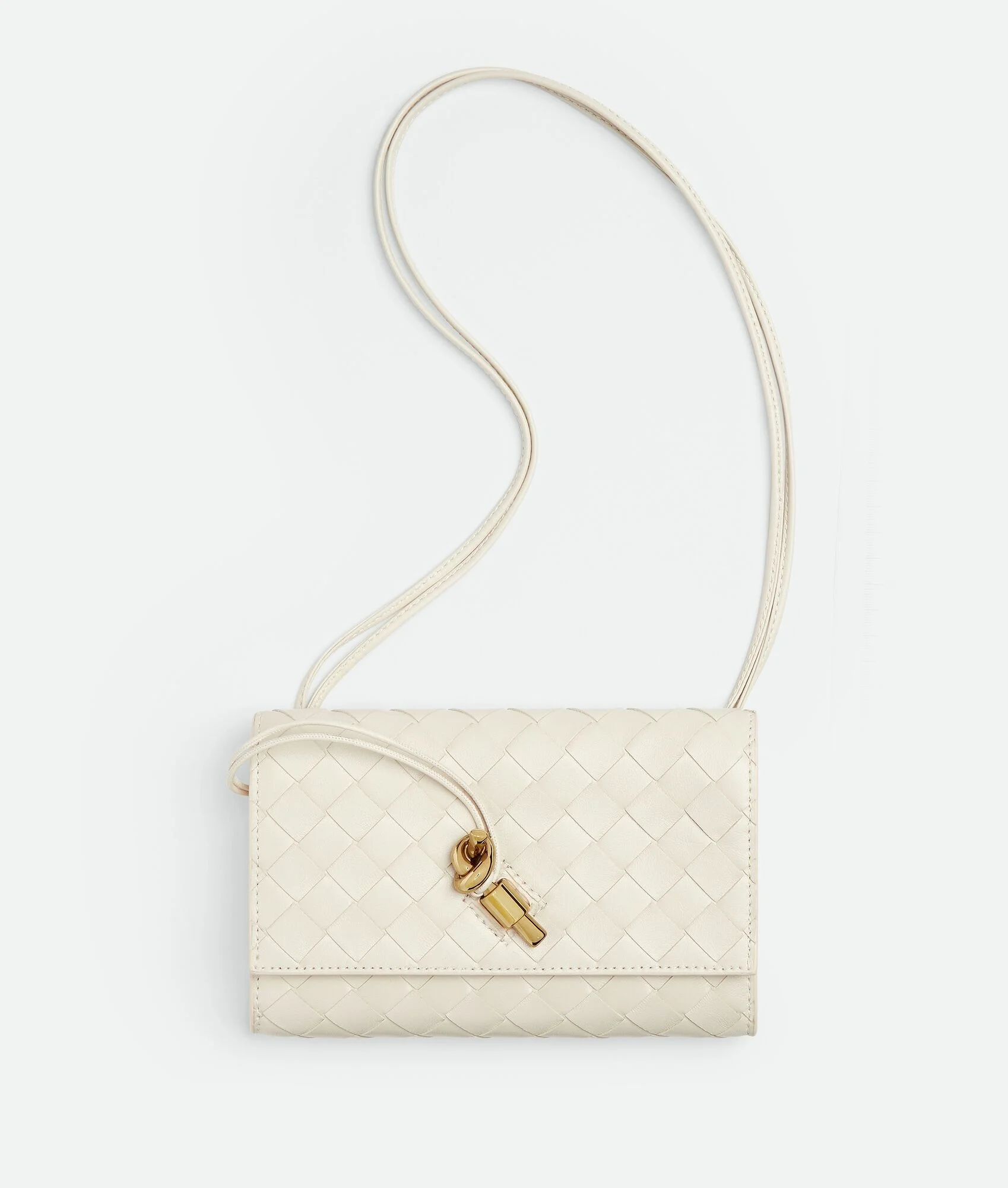 Pouch in Intrecciato nappa leather with signature knot closure and sliding strap. Product Details - Intrecciato nappa leather pouch - One main compartment, two card slots - Metallic knot closure - Sliding leather strap - Material: Lambskin - Lining: Calf leather - Color: Sea Salt - Hardware: Muse brass finish - Height: 12.6 cm | 5" - Width: 19 cm | 7.5" - Depth: 2 cm | 0.8" - Strap drop: 55 cm | 21.7" - Made in: Italy - Product code: 836940VCPP29195