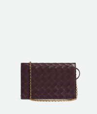 Pouch in Intrecciato nappa leather with signature knot closure and metal chain. Product Details - Intrecciato nappa leather pouch - One main compartment, two card slots - Metal knot closure - Metal chain - Lining: Calfskin - Color: Dark Barolo - Hardware: Muse Brass finish - Made in: Italy - Product code: 844107VCPP22264 Material - Material: Lambskin Size & Fit - Height: 12.6 cm (5.0") - Width: 19 cm (7.5") - Depth: 2 cm (0.8") - Handle Drop: 33 cm (13.0") - Fits iPhone 16 Pro Max, a credit card case, airpods and keys.