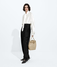 Product Details - Small Intrecciato leather bucket bag with sliding shoulder strap - Intrecciato leather internal pocket - Adjustable and detachable cross-body strap - Lining: Lambskin bonded Intrecciato - Color: Ecru - Hardware: Brass finish - Made in: Italy - Product code: 855759VCPP19616 Material - Material: lambskin Size & Fit - Height: 30 cm | 11.8" - Width: 18.5 cm | 7.3" - Depth: 11 cm | 4.3" - Handle drop: 25 cm | 26.6" - Strap drop: 45 cm | 17.7”