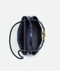 Top handle bag in supple Intrecciato leather with signature knot detail and sliding Product Details - Small Intrecciato leather top handle bag with sliding cross-body strap - Compartmented interior with one zippered pocket, one open pocket - Magnetic closure - Material: lambskin - Lining: Lambskin bonded Intrecciato - Color: Duke - Hardware: Brass finish - Height: 20 cm | 7.9" - Width: 25 cm | 9.8" - Depth: 10 cm | 2.6" - Handle drop: 6 cm | 2.4" - Strap drop: 50 cm | 19.7" - Made in: Italy - Product code: 766014VCPP14526