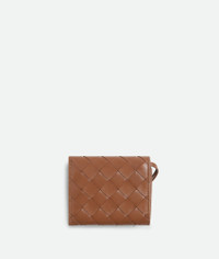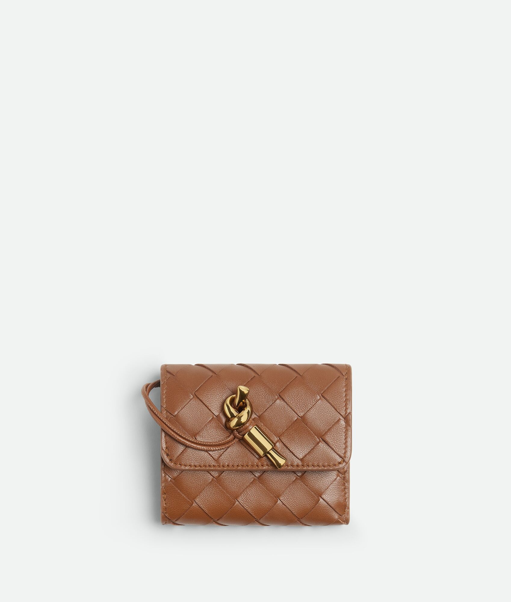 Intrecciato nappa leather wallet with metallic knot detail. Product Details - Four card slots, one bill compartment, one zippered coin purse - Press stud closure - Material: Lambskin - Lining: Calfskin - Color: Cognac - Hardware: Muse Brass finish - Height: 8 cm | 3.1" - Width: 10 cm | 3.9" - Depth: 2 cm | 0.8" - Made in: Italy - Product code: 741496VCPP22599