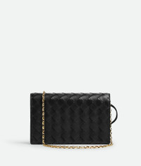 Pouch in Intrecciato nappa leather with signature knot closure and metal chain. Product Details - Intrecciato nappa leather pouch - One main compartment, two card slots - Metal knot closure - Metal chain - Lining: Calf leather - Color: Black - Hardware: Muse brass finish - Made in: Italy - Product code: 844107VCPP21019 Material - Material: Lambskin Size & Fit - Height: 11.5 cm | 4.5" - Width: 19 cm | 7.5" - Depth: 4 cm | 1.6" - Strap drop: 57 cm | 22.4"