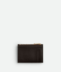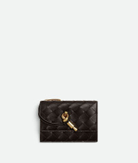 Zipped slim card case in Intrecciato nappa leather with signature knot detail. Product Details - Intrecciato nappa leather card case with metallic knot detail - Three card slots, one additional pocket, one zipped coin purse, one flap compartment with press stud closure - Material: Lambskin - Lining: Calf leather - Color: Fondant - Hardware: Muse brass finish - Height: 8.6 cm | 3.4" - Width: 12.5 cm | 4.9" - Depth: 1 cm | 0.4" - Made in: Italy - Product code: 838846VCPP22190