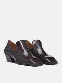 BOTTEGA VENETA loafers in brown, paneled leather upper construction, brushed leather, angled design, low-top, slip-on style, tonal topstitching, squared toe, angled block heel, logo-embossed sole, leather sole, lined. Made in Italy Upper: Calfskin Inner: Calfskin Italian Sizing
