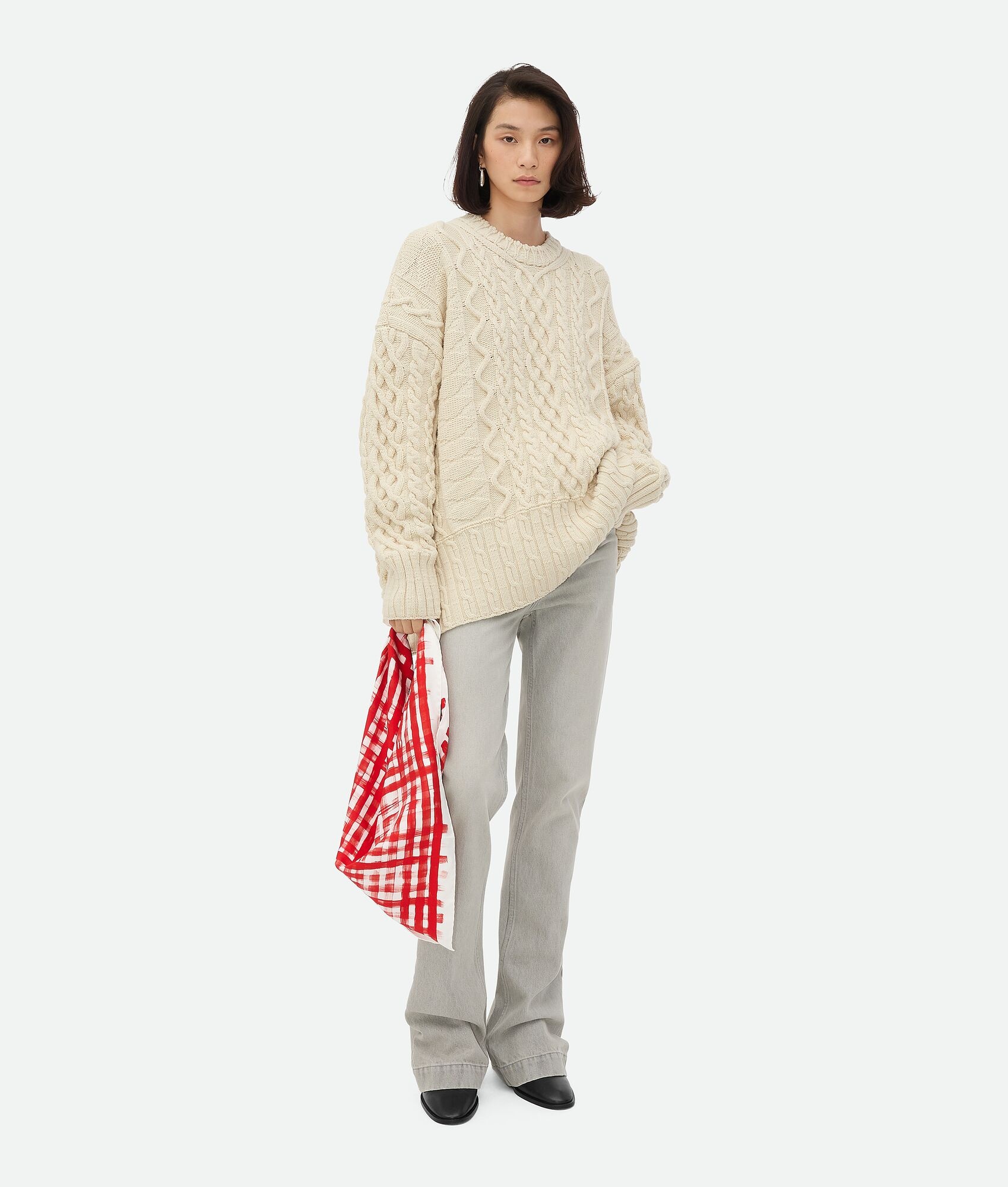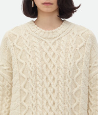 Jumper in Aran cable wool. Product Details - Aran cable wool jumper - Oversized fit - Material: 96% wool, 4% polyamide - Color: String - Made in: Italy - Product code: 821322V4XF02945 Size & Fit - Model is 178 cm | 5'10" and is wearing a Bottega Veneta size S