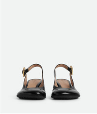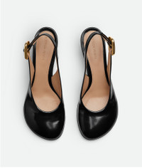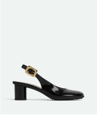 Slingback pump with rounded asymmetrical toe shape and signature buckle. Realised Product Details - Rubberized leather slingback pump - Material: Lambskin - Lining: Lambskin - Color: Black - Hardware: Gold finish - Heel: 5 cm | 2" - Made in: Italy - Product code: 778535V2LR01000
