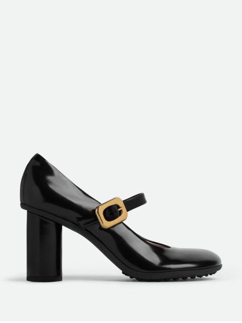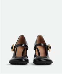 Mary-jane pump with rounded asymmetrical toe shape and signature buckle. Realised Product Details - Rubberized leather Mary-Jane pump - Material: Lambskin - Lining: Lambskin - Color: Black - Hardware: Gold finish - Heel: 7.5 cm | 3" - Made in: Italy - Product code: 778536V2LR01000