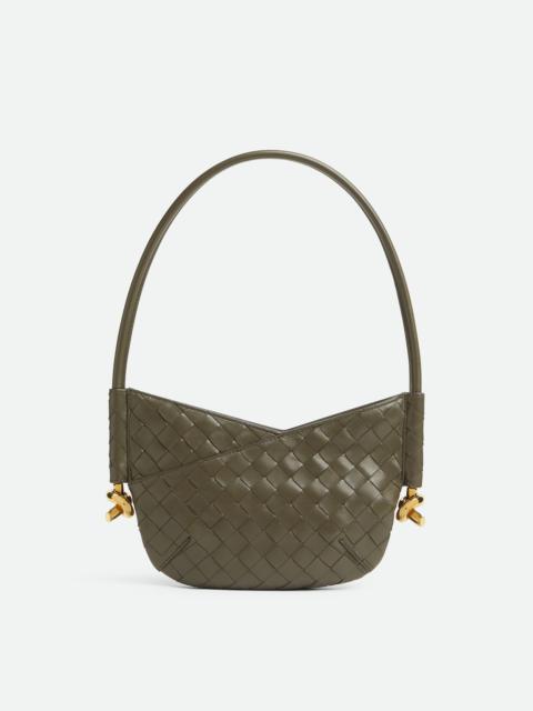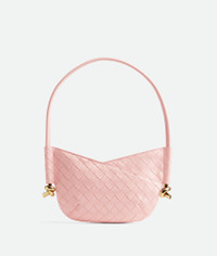 Shoulder bag in Intrecciato leather with signature knot details. Product Details - Mini intrecciato leather shoulder bag - One main compartment - Zip closure - Material: Lambskin - Lining: Lambskin - Color: Rose - Hardware: Brass finish - Height: 18 cm | 7.1” - Width: 28 cm | 11” - Depth: 5 cm | 2” - Handle drop: 25cm - Made in: Italy - Product code: 796378VCPP16858 Size & Fit - Fits iPhone 16 Pro Max, a credit card case, airpods and keys.