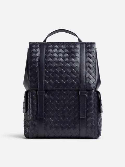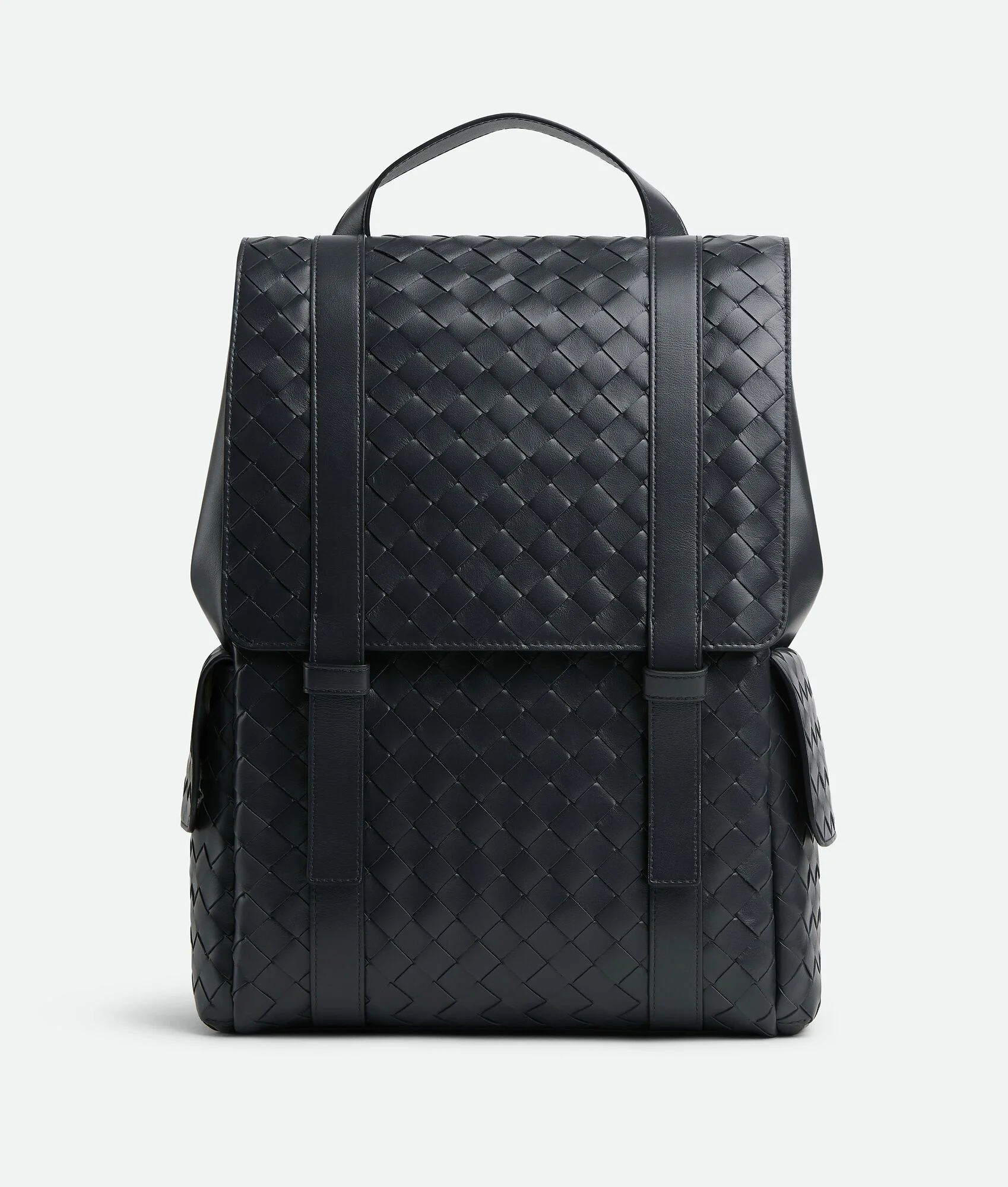 Backpack in Intrecciato leather. Product Details - Intrecciato leather backpack - Two exterior flap pockets - Single interior laptop compartment and two open pockets - Flap closure - Lining: Canvas - Color: Ardoise - Hardware: Silver finish - Height: 39 cm | 15.4" - Width: 31 cm | 12.2" - Depth: 14 cm | 5.5" - Handle drop: 6 cm | 2.4" - Made in: Italy - Product code: 805971V2HL12077 Size & Fit - Fits a 16" laptop, A4 documents, and a tablet