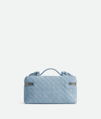 Vanity case in Intrecciato suede with detachable strap. Product Details - Intrecciato suede vanity case with detachable strap - One main compartment, one flat pocket - Zipped closure - Material: Calfskin - Lining: Lambskin - Color: Ice - Hardware: Gold finish - Height: 12.5 cm | 4.9" - Width: 22 cm | 8.7" - Depth: 5 cm | 2" -Handle drop: 4.5 cm | 1.8" -Strap drop: 45 cm | 17.7" - Made in: Italy - Product code: 789109V1QE71729 Size & Fit - Fits iPhone 16 Pro Max, a credit card case, airpods and keys.