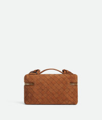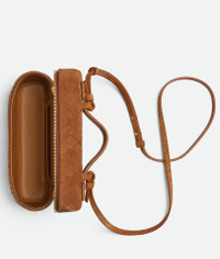 Vanity case in Intrecciato suede with detachable strap. Product Details - Intrecciato suede leather vanity case with detachable strap - One main compartment, one flat pocket - Zipper closure - Lining: Lambskin - Color: Amber - Hardware: Gold finish - Made in: Italy - Product code: 789109V1QE72588 Material - Material: Calfskin Size & Fit - Height: 12.5 cm | 4.9" - Width: 22 cm | 8.7" - Depth: 5 cm | 2" -Handle drop: 4.5 cm | 1.8" -Strap drop: 45 cm | 17.7"